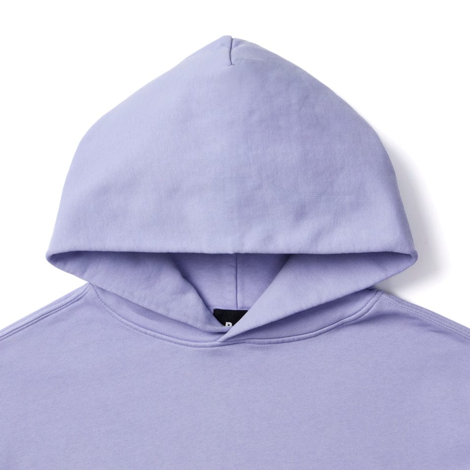 Lavender hooded sweatshirt with ’R.A.D’ printed on the chest.
